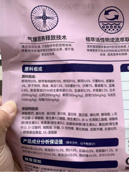 麦富迪自有超级工厂,工艺也是很值得一提的点。生骨肉冻干采用航天食品级的冻干工艺,在 -35℃的真空环境下进行72小时冷冻干燥。相比传统高温烘干工艺,能保留96%以上的天然营养素,避免蛋白质变性,,程度保留食材的营养和风味。另外,麦富迪自主研发的专利气爆营养释放技术,可以通过精确控制压力处理,破坏植物细胞壁中的纤维素结构,从而释放出更多可消化营养素,同时降低抗营养因子的含量,让狗狗能更好地吸收营养。