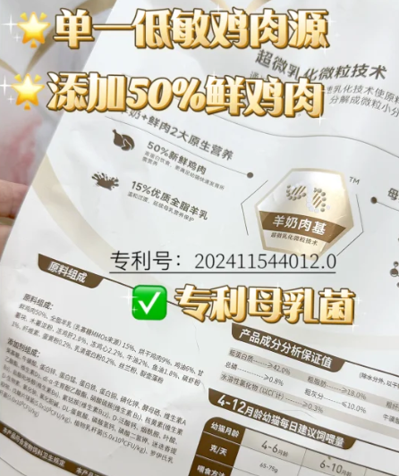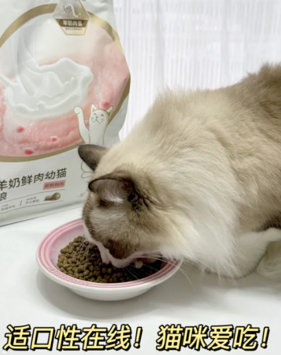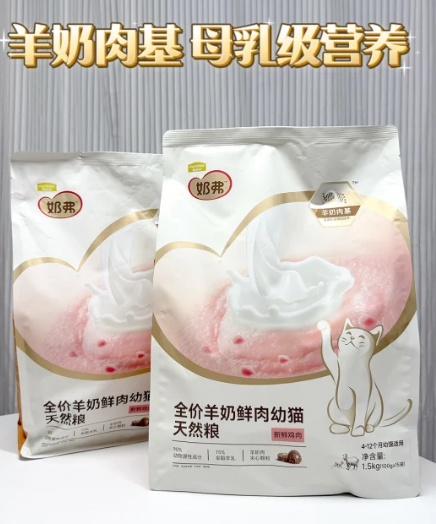 它的配方我研究过,50%新鲜鸡肉打底,粗蛋白直接拉到42%以上,完全满足幼猫快速长身体的需求。15%的全脂羊乳,搭配鲜肉,奶香肉香融合得刚刚好。羊乳本身温和,富含乳蛋白和乳脂肪,对小猫来说就像“第二口粮”,帮助平稳过渡,不容易闹肚子。