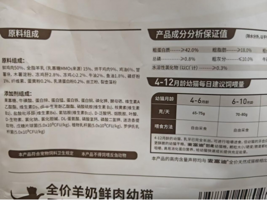 这款幼猫粮的配方是专门为4~12月的小猫咪设计的,对比我之前了解过的不少幼猫粮,这款粮的配方着实的让我眼前一亮,它创新的采用了生羊乳与鲜肉这两大原生营养的组合搭配,不仅营养丰富而且也更为贴近猫咪的母乳营养,为幼猫的健康成长筑牢根基。不仅如此,配方中还添加了麦富迪专利的3种母乳菌,这可是麦富迪奶弗系列在深入研究猫咪母乳后,选取其中有助于呵护幼猫肠胃和增加免疫力的菌株,经过人工培养增殖后添加到产品里的,可以大大延续对幼猫母乳级别的呵护。同时,配料表里也没有乱七八糟的添加物,小猫长期吃我也十分放心。