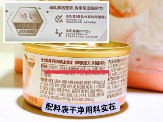 这款罐罐主打的就是离乳期幼猫的营养过渡,配方真的挺“妈生”的——什么叫“妈生”?就是尽量贴近母乳的营养结构,让小猫从喝奶到吃固体食物的过程更平稳。它里面加了15%的生羊乳液态入料,不是奶粉勾兑,而是直接把新鲜羊乳融进肉酱里,未经高温加工,避免了乳铁蛋白、乳清蛋白这些活性营养的流失,不容易被破坏,对提升小猫免疫力特别有帮助。再加上羊乳寡糖MMOs,和乳铁蛋白一起,堪称“免疫黄金CP”,给小猫撑起一层保护屏障,换季也不怕它动不动就打喷嚏了。