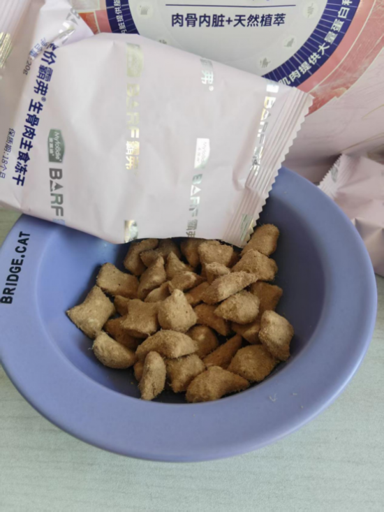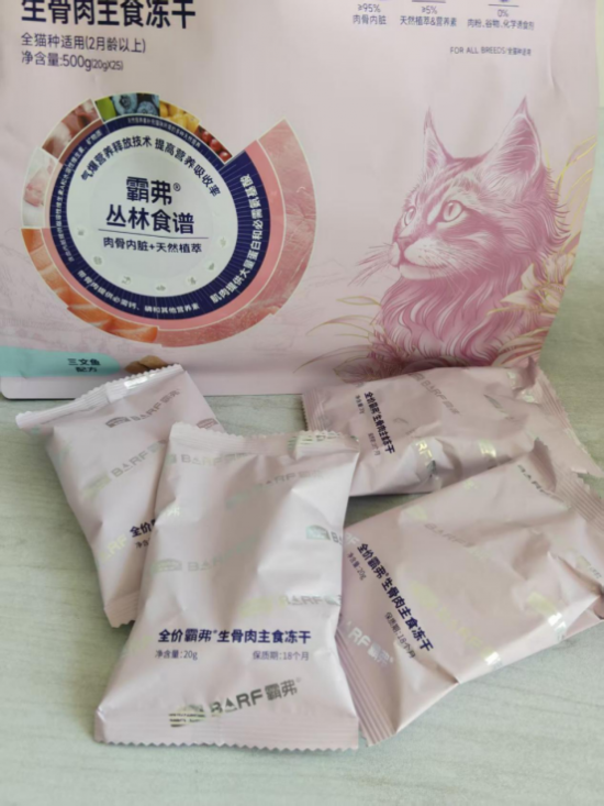 首先这款主食冻干的配方在营养搭配上就非常的科学,众所周知,猫咪可是天生的肉食性动物,挑选、肉含量高的冻干是必不可少的,这款麦富迪霸弗主食冻干的区别就在于通过生骨肉替代掉纯肉模式,整体高达95%生骨肉含量内包含了75%鲜肌肉、10%带骨肉、10%含血内脏成分,在很大程度上模拟出一整只猎物的全部营养结构,在鲜肌肉为猫咪提供大量优质蛋白质的同时,其中带骨肉中所富含的钙、磷,以及带血内脏内所提供的脂溶性维生素A和水溶性维生素矿物质等,也都是猫咪日常所需的重要营养。