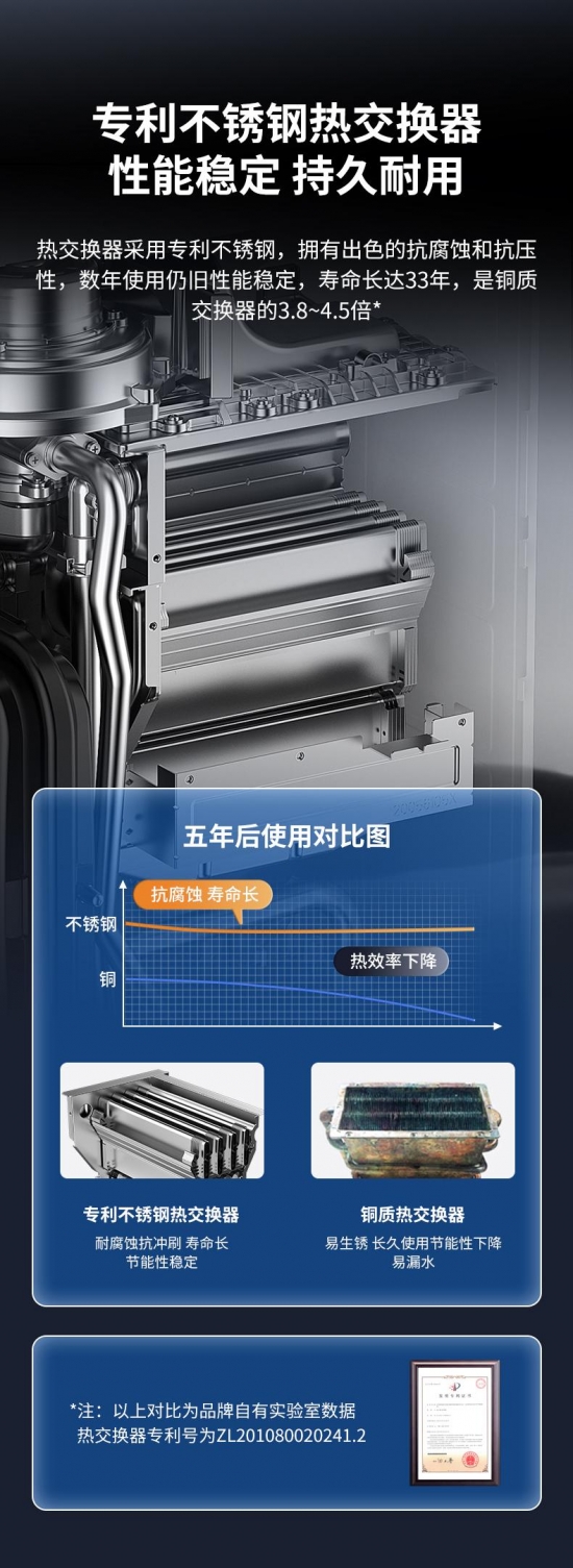 同时,其,的“同向顺流”设计的专利不锈钢热交换器(专利号:ZL201080020241.2),不仅抗腐蚀、寿命长达33年(是铜质交换器的3.8-4.5倍),还能通过冷凝水自清洁,减少维护成本,确保长期高效运行。
