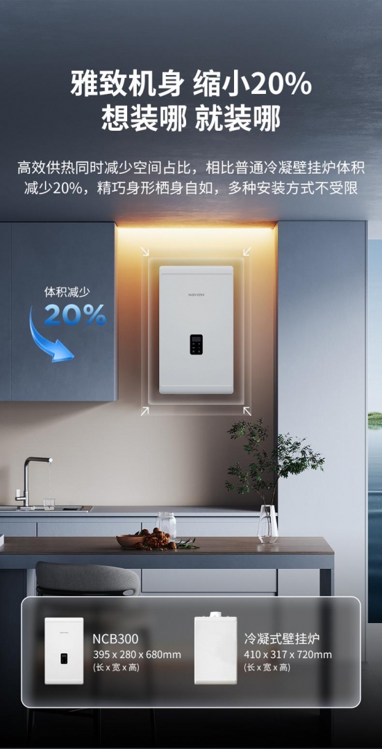 此外,NCB300还兼顾环保与实用性:可混合20%氢气燃烧,减少二氧化碳排放;机身尺寸仅395×280×680mm,比普通壁挂炉体积缩小20%,小户型也能轻松安装。