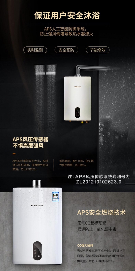 在防一氧化碳中毒方面,NGW570搭载APS专利安全燃烧技术。其风压传感器能实时感知风力大小,智能调节风机转速,即便遭遇12级台风,也能抵抗强风倒灌,保证燃气稳定燃烧不熄火。当系统检测到燃烧不充分时,会自动补正风量、合理分配供氧量,并将产生的一氧化碳强力抽排,从根源上杜绝中毒风险,无需依赖CO超标预警。