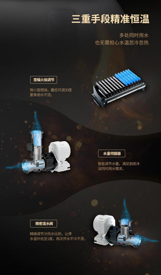 面对水温不稳定的问题,NGW570采用三重智能恒温技术。30段宽幅火焰调节支持30°C-60°C精准控温,夏季可低至35°C不烫肤,冬季洗碗能稳定在40-45°C;水量伺服器可智能调节水量,满足厨房与浴室同时用水需求;精密混水阀则能将停水温升控制在1℃以内,再次开水避免忽冷忽热,体感温差近乎为零。