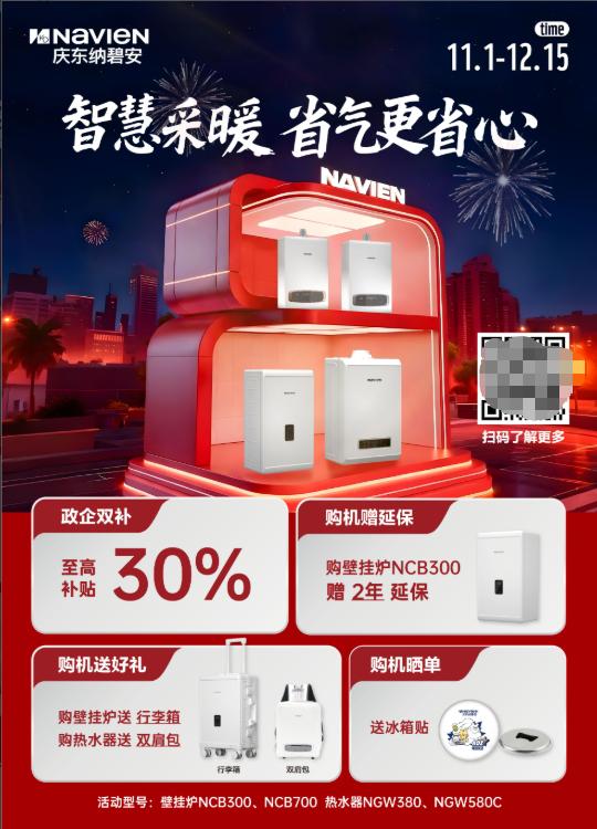 当然,选购时除了产品本身,优惠活动也是,——近期庆东纳碧安正推出“智慧采暖省气更省心”活动,时间从11.1持续到12.15,针对NCB300等型号的福利相当实在:首先是“政企双补”,,可享30%的补贴,直接降低购机成本;其次,购买NCB300可获赠2年延保,让后期使用更安心;同时还有“购机送好礼”:买壁挂炉送行李箱,买热水器送双肩包;晒单还能额外获得冰箱贴等周边。