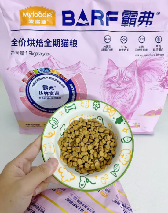 这款麦富迪霸弗烘焙猫粮算是我挖到的宝了,开袋瞬间就被扑面而来的肉香击中——不是那种低端猫粮的刺鼻感,霸弗系列可是麦富迪的高端品线,那种新鲜肉肉经过低温烘焙后自然散发的醇厚香气,是小猫咪嗅觉与味觉的双重盛宴。BARF霸弗丛林食谱,贴合原始犬猫猎食结构, 这绝不是简单的食材堆砌,它是由 80%的原始配方构成,带骨肉、内脏与植萃浆果的粗犷组合,每一口都是对基因记忆的唤醒,是猫猫狗狗喜欢的天性饮食。而且猫粮颗粒完全不会黏腻沾手,这干爽度对南方潮湿天气简直太友好了,还能有效缓解黑下巴。三段式轻度烘焙,65℃塑形—85℃熟化—100℃轻烘-灭菌增香,查了配方表才发现居然用了90%的动物原料,难怪猫猫爱吃,每颗都酥脆得像小饼干一样,适口性在线。而且麦富迪还采用专利气爆技术,使食谱中的组合营养充分融合,满足猫咪的营养需求,提高营养吸收率,吃起来好像开了猫猫吃播,咔嚓咔嚓特别过瘾。