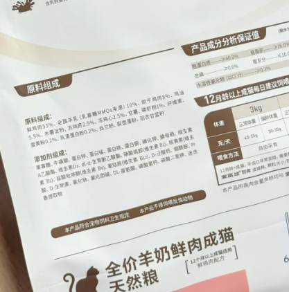先看配方,就很戳我这种注重原料和营养均衡的家长。这款粮主打“双核营养体系”,55%鲜肉+10%原生羊乳的搭配挺特别。鲜鸡肉排在首位,占比75%,是实实在在的主料,没有拿肉粉糊弄,这点就很靠谱。而羊乳的加入不只是噱头,它是以液态形式低温锁鲜添加的,保留了乳铁蛋白、免疫球蛋白等活性成分。羊奶本身脂肪球小,分子结构接近猫母乳,对乳糖不耐的猫咪更友好,也更容易吸收。我家猫以前换粮常有软便情况,这次过渡却特别顺利,便便状态稳定,成型度高,官方说有97.2%的成型率,我家实测基本吻合,算是意外之喜。