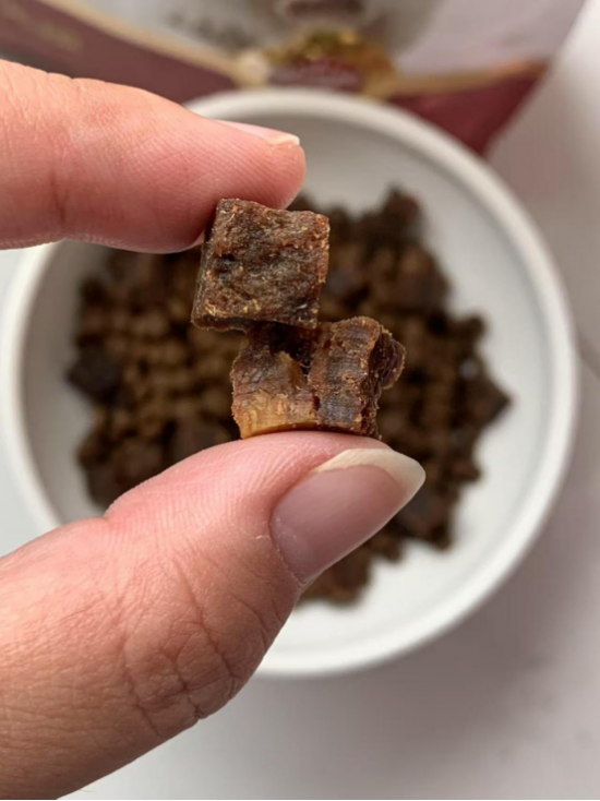 关键是,它不靠香精诱食。开袋是淡淡的肉香,没有刺鼻油味或廉价香精味,连我都忍不住拿一粒尝了尝——是那种自然的肉香,嚼起来有韧劲,确实像真肉。这说明它用的是优质原料,而不是靠味道“骗”狗狗吃。