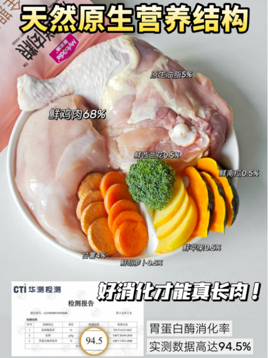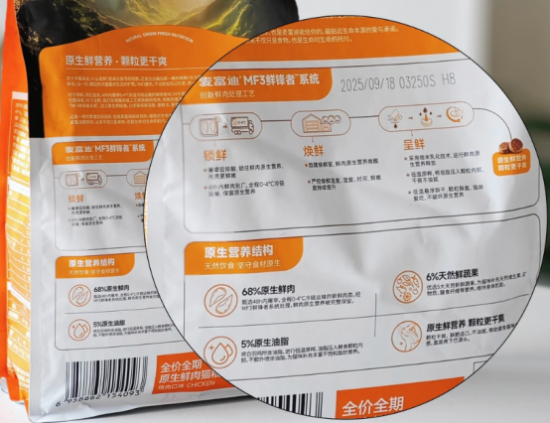 特别想提一下它的“MF3鲜锋者系统”,这套工艺真的有点东西:锁鲜:屠宰后排酸+低温冷链,保证肉质新鲜;焕鲜:自建焕鲜室让肉质舒展,提升蛋白利用率;呈鲜:微米乳化+低温悬浮烘干,形成“外干内润”的酥脆结构,既干爽又营养不流失。