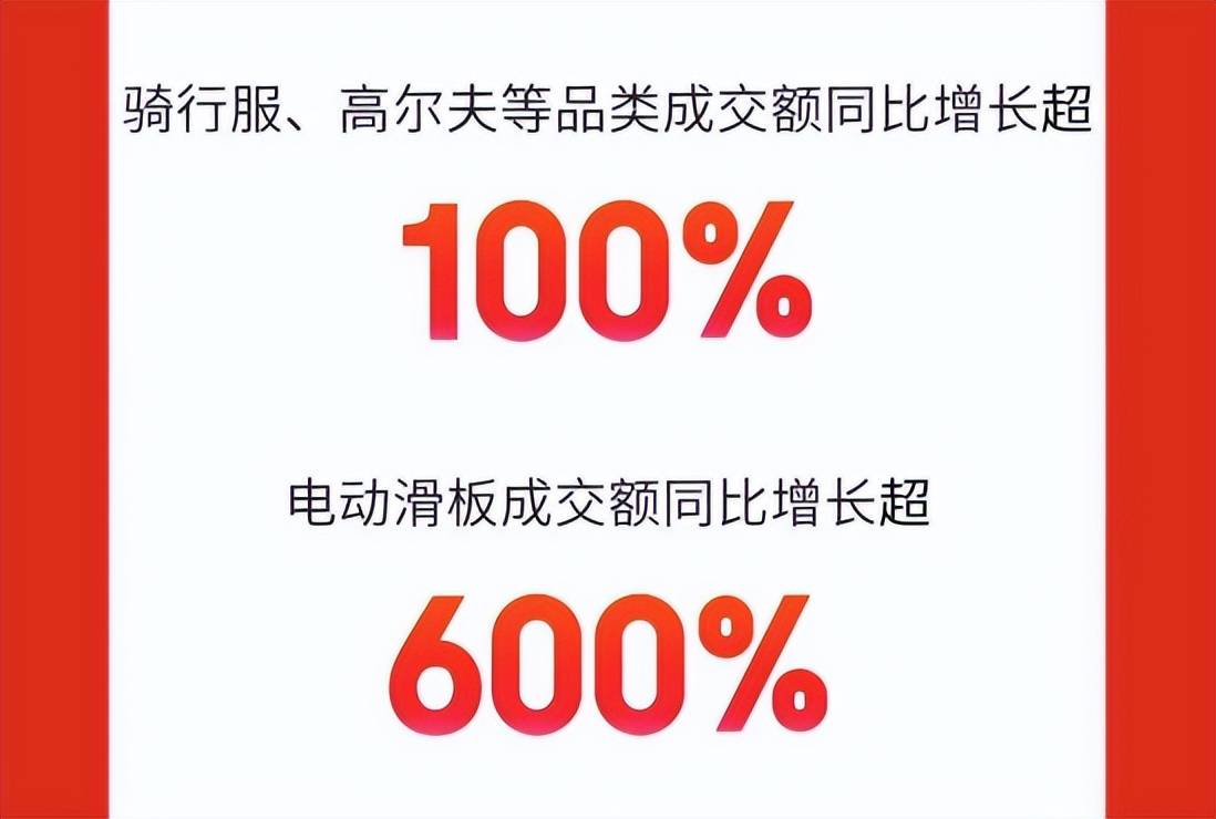 与此同时,随着户外运动成为新的潮流生活方式,骑行服、高尔夫等品类成交额同比增长超100%;出行小高峰堵车成为常态的背景下,电动滑板也成为了日常畅通出行的最佳选择,成交额同比增长超600%;