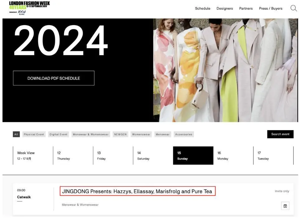 近日,2024年伦敦时装周官方日程公布。有网友在秀场日程安排中,发现“JINGDONG”字样出现在官方日程中。日程信息显示,“JINGDONG”将于伦敦时间9月15日上午9点,与HAZZYS、Ellassay、Marisfrolg、Pure Tea等多个品牌共同亮相。有网友猜测,“JINGDONG”或许即为国内知名电商平台京东。若消息属实,这将是京东第六次参与国际时装周。