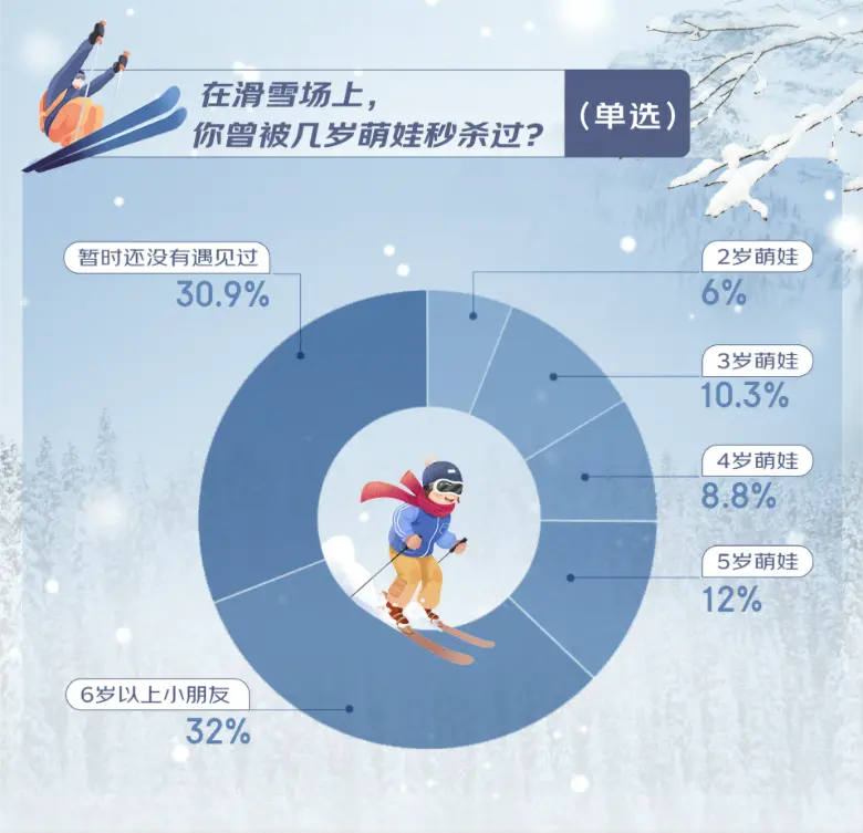 而在今年冬天滑雪场上,还涌现出了许多有趣的现象,比如“公主抱滴滴代滑”服务、在滑雪场加班办公、背着烧烤炉卖烧烤等,为滑雪运动注入了更多活力和乐趣。同时,儿童滑雪热潮悄然兴起,数据显示近4成的父母倾向于让孩子在6岁以下就开始学习滑雪;36.5%的受访者表示曾在雪场上被“小孩哥”“小孩姐”秒杀。