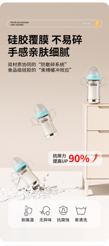 传统玻璃奶瓶虽材质安全,但缺乏有效防护,跌落极易碎裂,可能对宝宝造成伤害。贝舒静以“父母之心”为出发点,研发硅胶玻璃一体成型技术,推出防摔碎、防散碎的安全奶瓶。外层采用食品级液态硅胶紧密包裹内胆高硼硅玻璃,二者,融合,既保留玻璃的纯净耐高温特性,又通过硅胶层缓冲撞击,实现“刚柔并济”的双重保护。