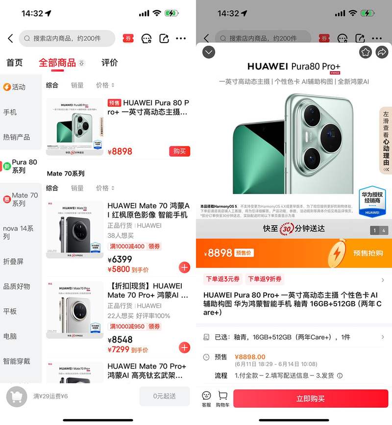小编关注到,华为Pura 80系列新机已经在京东上开启了预售,如果对拿到新机有更高速度要求的,还可以通过京东秒送来预约,通过附近门店来发货,最快9分钟新品就能送到了。小编也已经下了单,坐等开售啦。