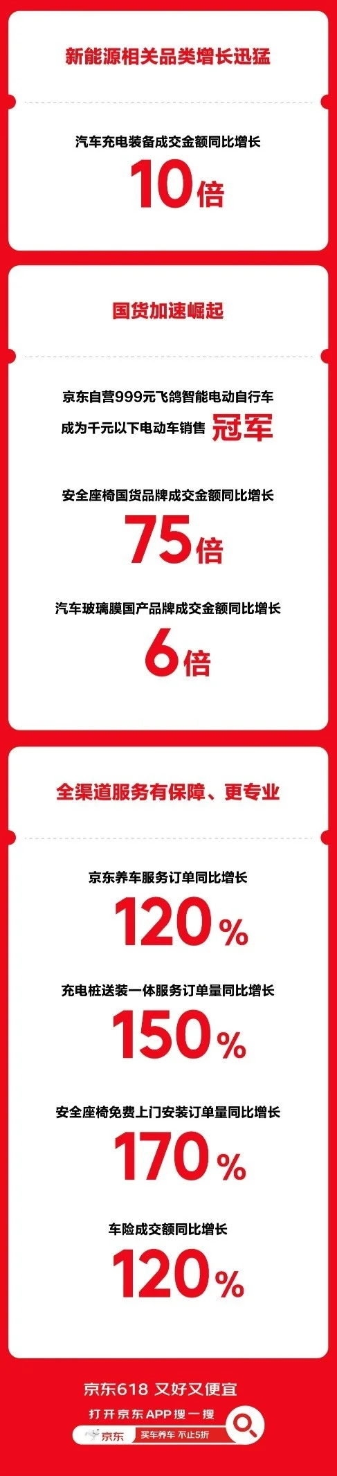 随着用户服务需求持续升级,京东汽车全渠道服务迎来显著增长。京东养车服务订单量同比增长120%,专业维保服务获得用户认可。充电桩“送装一体”服务订单量同比增长150%,安全座椅免费上门安装服务订单量同比增长170%,彰显便捷安装服务已成用户关注的消费焦点。同时,车辆保护需求旺盛,隐形车衣成交金额同比增长185%,车险成交额同比增长120%。京东汽车以“有保障 更专业”的全渠道服务,助力用户综合保障体验稳步提升。