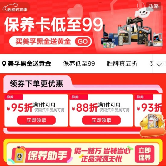 在政府补贴享9折优惠基础上,京东养车启动补贴加码,联合品牌进行“补上加补”,叠加多重补贴至高可省50%。具体来看,针对机油保养等刚性需求,基础车型车主可,壳牌全合成机油5w-40 API SP级 1L,到手价仅70元;针对高端养护需求,京东养车联合品牌推出购买美孚曜石黑金系列产品享“包工时费+赠机滤+送黄金”三重权益,消费者晒单后实际到手价仅309元。