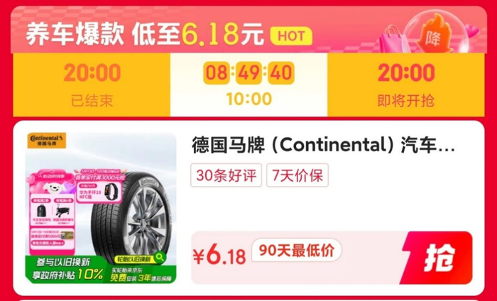 轮胎品类福利也同步加码,德国马牌、阿特拉斯等国际,轮胎6.18元限时秒杀,朝阳、玲珑等国产轮胎,8.8元起。针对卡罗拉、朗逸、宝来等热销车型适配的米其林耐越195/65R 91V轮胎,日常价为532元,活动期间京东爆款直降叠加政府补贴享75折优惠,到手价仅需299元。覆盖多元消费需求,让消费者真正实现养车省钱又省心。