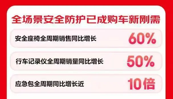 “道路千万条,安全第一条”,京东汽车618期间,安全相关的汽车用品迎来爆发式增长。时刻守护车上儿童安全的安全座椅全周期成交额同比增长60%。而随着消费者安全应急意识的加强,应急包全周期成交额同比增长近10倍。与此同时,行车安全需求的稳步提升,也带动行车记录仪全周期销量同比增长50%,持续为日常行车安全保驾护航。