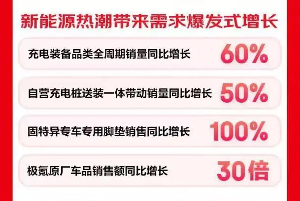 近年来随着新能源汽车保有量的持续攀升,更多车企和新势力品牌入场,引爆了与其高度适配的周边产品的消费需求。作为新能源车的配套硬件,京东汽车618期间充电装备品类全周期销量同比增长60%。当好产品更要配好服务成为消费者共识,自营充电桩送装一体带动销量同比增长50%,为用户带来更省心的购物体验。此外固特异专车专用脚垫成交额同比增长100%,极氪原厂车品销售额同比增长30倍,展现出新能源汽车用品品类强劲的消费增长势能。