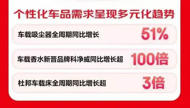 “悦己型消费”也成为今年京东汽车618的一大看点。当汽车逐步由出行工具演化为“移动生活空间”,消费者对提升驾乘体验的个性化需求也迎来高速增长。数据显示,随着短途旅行、露营等出行需求增加,杜邦车载床全周期成交额同比增长超3倍,为消费者带来“居家式”驾乘体验。与此同时,车载生活电器品类持续热销,车载吸尘器全周期成交额同比增长51%,以便携工具助力消费者保持爱车整洁。从品牌表现来看,车载香水新晋品牌科净威成交额同比增长超100倍,印证了消费者对汽车个性化品质空间需求的爆发。