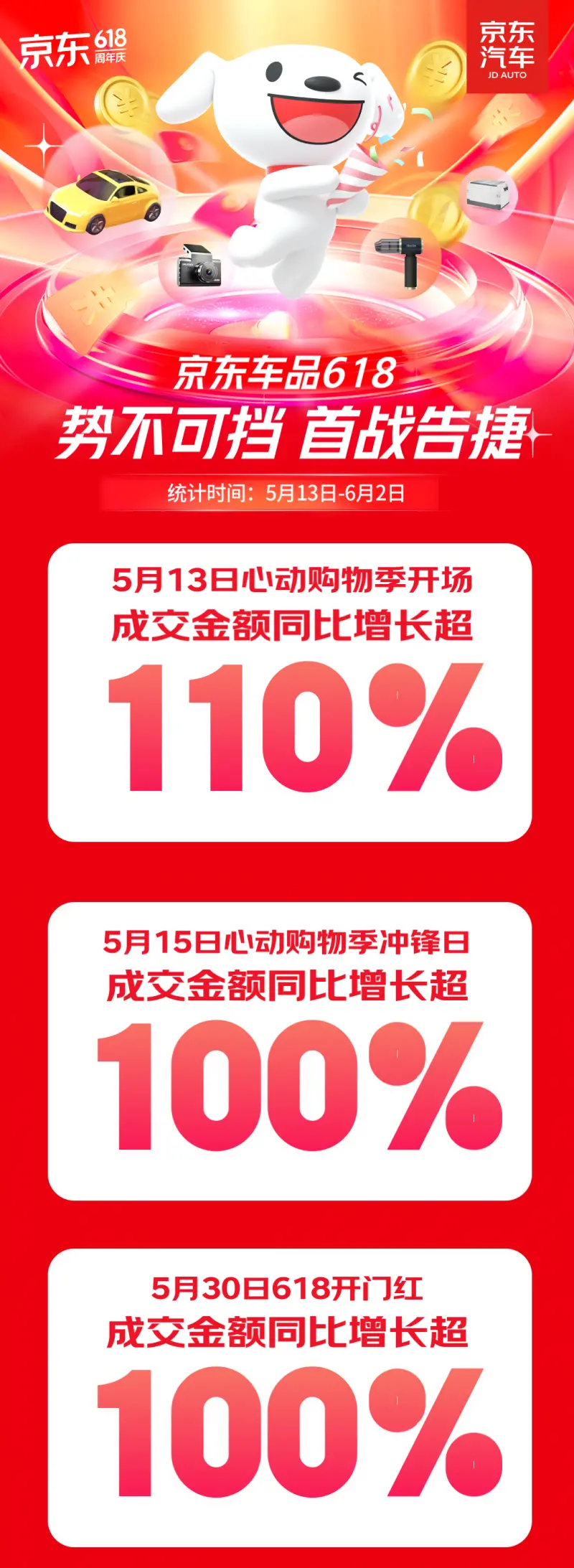 京东汽车618期间,汽车用品消费势能强劲,5月13日至6月2日三大关键节点均交出亮眼成绩单。其中5月13日心动购物季开场成交金额同比增长超110%,5月15日心动购物季冲锋日与5月30日618开门红成交金额同比增长均超100%。整体来看,智能化品类、家庭出行安全装备及新能源配套产品成为汽车用品的核心增长引擎。