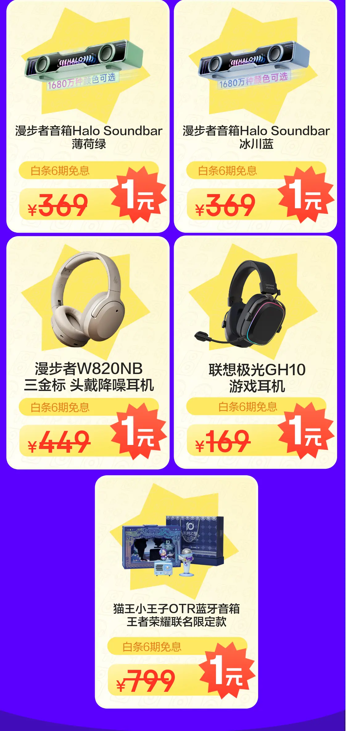 漫步者音箱Halo Soundbar薄荷绿款、冰川蓝款以时尚潮流外观成为年轻人,的音箱爆品。音箱的RGB灯效瞬间让桌面充满了电竞氛围,其音效更加饱满,不论是玩游戏、看电影,它都能为用户带来,的体验。漫步者W820NB三金标头戴降噪耳机、联想极光GH10游戏耳机、猫王小王子OTR蓝牙音箱王者荣耀联名限定款也凭借,的音质体验和别具一格的外观设计成为用户热门选择,在京东618,爆款耳机音箱1元就有机会到手,来拼手气!