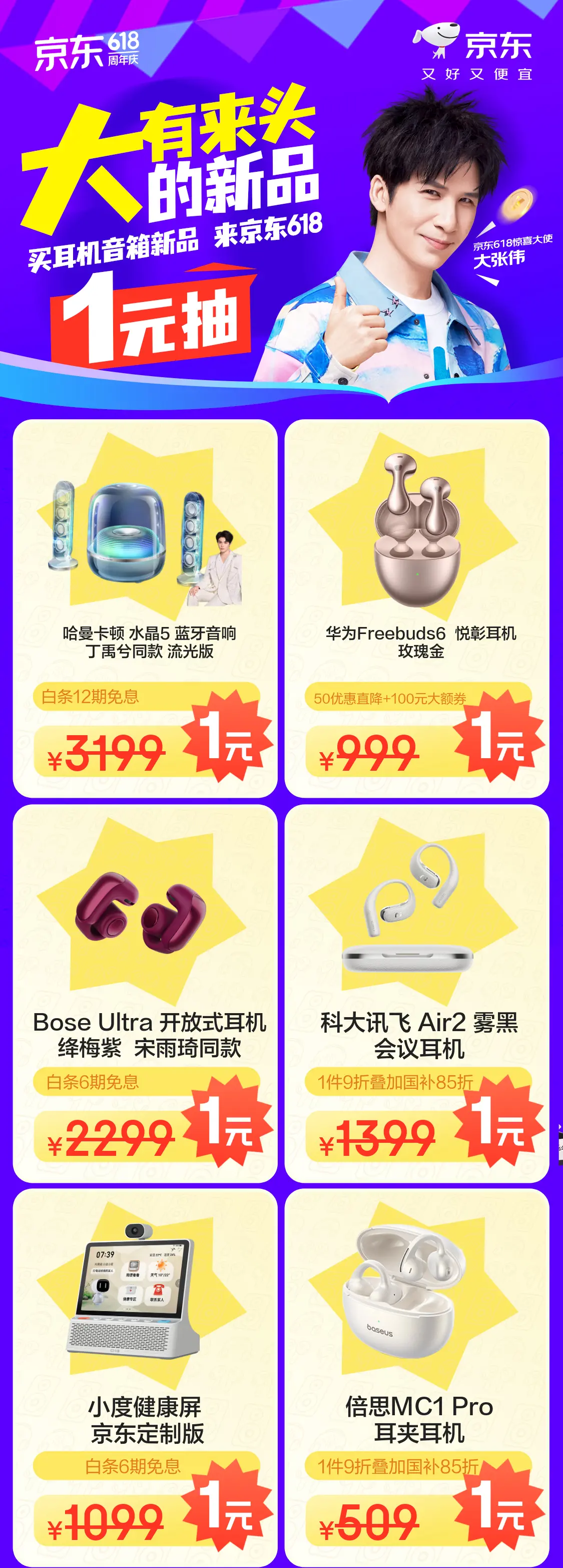 无论是沉浸式的视听享受,还是高效的办公沟通、畅快的游戏体验,都离不开高品质的耳机音箱。玩转声音的艺术,京东携手京东618惊喜大使大张伟带来“大有来头的新品”——耳机音箱新品1元抽活动。耳机音箱联合京东新品,在新品频道打造“音频数码尖货周”定制活动,打开京东新品频道的尖货抽签就能看到耳机音箱当热新品1元抽活动。登录京东APP搜索“音频省上加省”,海量又好又便宜的耳机、音箱新品,拼手气1元抽!还有国家补贴立省15%,叠加大额神券、分期免息等多重福利等你来!