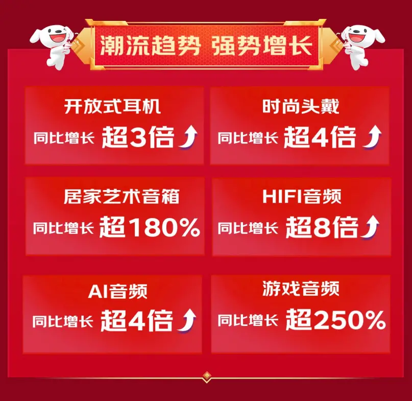 在音频市场不断迈向多元化发展的进程中,京东618六大音频消费领域均实现了强势增长,引领市场潮流。开放式耳机同比增长超3倍,成为追求自由舒适佩戴体验消费者的,。时尚头戴耳机同比增长超4倍,展现了兼具实用性与潮流外观的头戴式耳机越来越受到消费者青睐。居家艺术音箱同比增长超180%,反映出消费者对家居环境美化与音质享受的双重渴望。HIFI音频同比增长超8倍,则表明了消费者对高保真,音效的热烈向往这一趋势。AI音频同比增长超4倍,充分说明用户对智能交互音频产品的需求正逐步提升。游戏音频同比增长超250%,则是精准满足了游戏爱好者对专业耳机的需求。