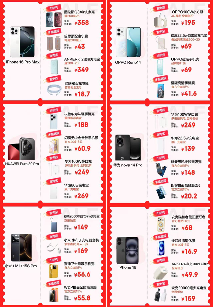 现如今,换个手机配件等于换个新手机的购物心理让手机壳等配件持续热销。活动期间,图拉斯Q3Air支点壳满200减25,到手价358元;决色华为认证手机壳新品,仅188元;与此同时,充电宝、手机膜、充电线等均可享受官方立减15%、跨店满减等优惠,趁大促抢先入手,以备不时之需才是明智之选。