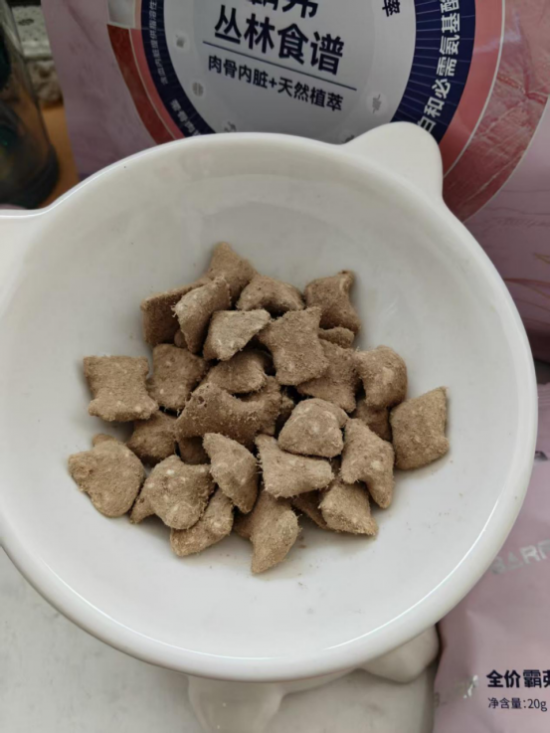 打开包装一股浓郁鲜香的肉味扑鼻而来,酥酥脆脆的质地再搭配上超可爱枕头形状的冻干,别说小猫了,我都快忍不住的尝一尝了。特别是我刚“嘶啦”一声撕开包装袋,平日里对食物百般挑剔的小馋猫,直接秒变小馋鬼,眼睛直勾勾地盯着我手里的袋子,小爪子还不安分地扒拉我,当冻干倒在它食盆的一瞬间,小家伙半秒都没有迟疑,直接开启“吸尘器”模式,没一会工夫碗里被它舔的那叫一个干净,连一点渣子都没剩下。这还是平时那个挑食的小猫吗?