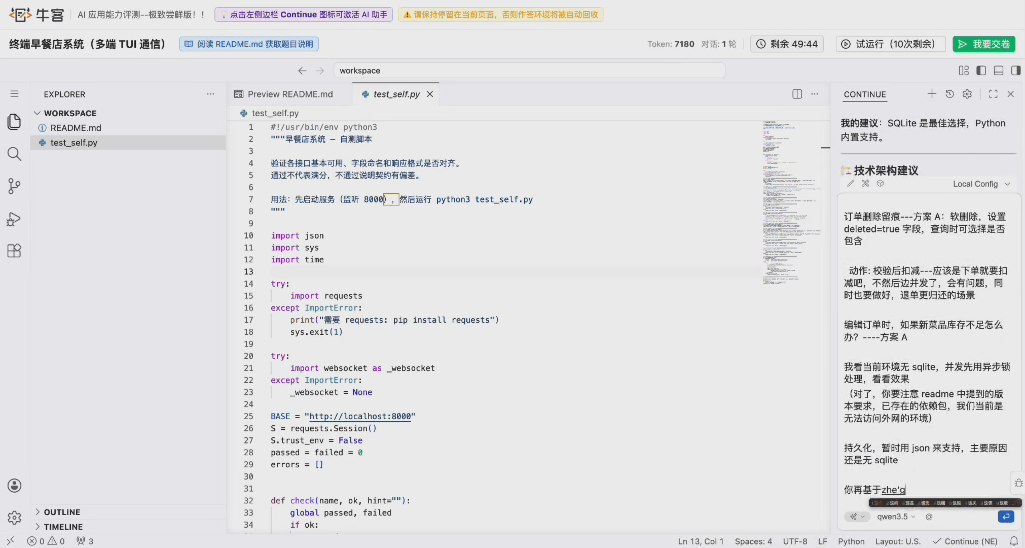 本案例模拟真实AI辅助开发场景。考生在内置IDE中借助AI助手,基于README与checklist,独立完成“终端早餐订餐系统”的多端TUI通信开发,涉及WebSocket、HTTP、并发管理,持久化存储等真实技术栈。
