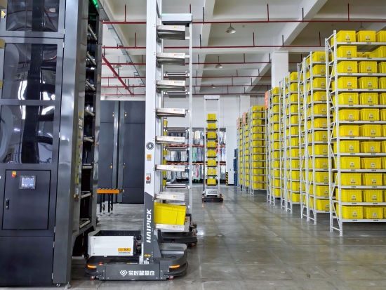在硬件部署层面,宝时云仓投入打造机器人智慧仓集群,配置AGV无人搬运设备、新型智能化高位存拣一体设备、智能灯光分拣系统等自动化设施,实现仓储作业的人机协同运转。通过搭建日常处理的订单通道,仓库的发货差错率可控制在万分之一以下,当天17点前送达的订单当日即可完成出库。智能仓内按自动化流程铺设了“货到人”的拣选模式,系统会根据客户订单信息,自动推送货品到作业工位,减少人员往返寻找的时间损耗;在管理人员、项目及SKU体量较大的日常运作中,拣货和上架环节仅需少量员工即可完成作业,人员效能较传统模式提升4-5倍。
