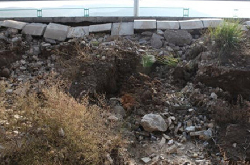 这是塌陷的护坡,按照设计标准所有材料均不合格,薄薄的石头片直接铺在黄土上。