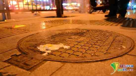 将鸡蛋磕在铁质的窨井盖上,鸡蛋清散开后很快凝固,蛋黄液很快变硬,几分钟后,鸡蛋竟然熟了。
