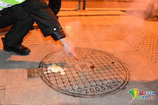 9点30许,记者闻讯赶到现场。在现场记者看到,磕在窨井盖上的鸡蛋确实已经熟了,巡防队员王新强用小木棍试了试发现鸡蛋黄已经挑不开了。巡防队员王新强用手一探窨井盖表面温度称大约有六七十度。