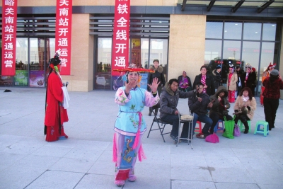 车站广场上,市民用歌舞迎接首列高铁的到来。