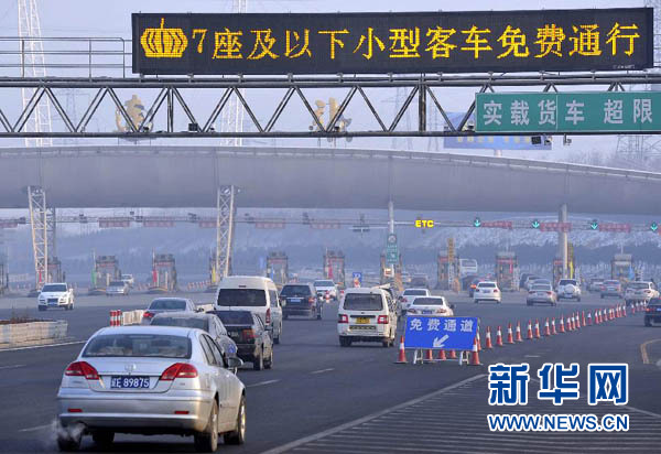 资料图片:2013年2月9日 全国高速路今起免费7天。图为大批小型客车免费通过大连收费站驶入沈海高速公路。新华社发(刘德斌 摄)