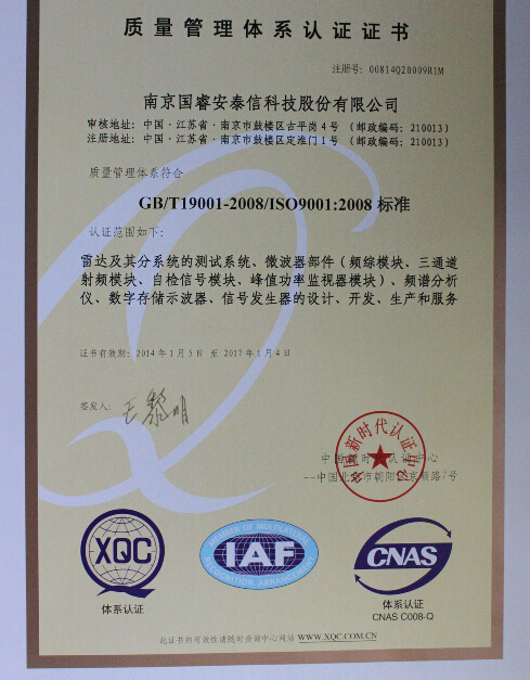 国睿安泰信科技股份有限公司取得了中国新时代认证中心颁发的仪器质量管理体系认证证书。该证书适用范围是公司的频谱分析仪、信号发生器、数字存储示波器、雷达及其分系统的测试系统、微波器部件(射综模块、三通道射频模块、自检信号模块、峰值功率监视器模块)的设计开发、生产和服务。