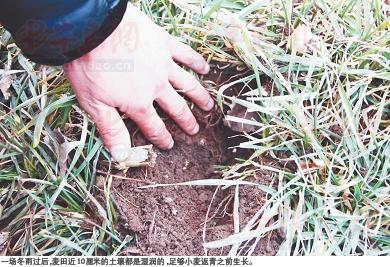 刘宝敬告诉记者,现在小麦正处于休眠状态,对水分的需求并不太多,因而这场雨并不能解决温暖气候带来的问题,“现在的大问题是病害、虫害能够安全越冬,到了春节病源、虫源的基数就变大,导致纹枯病、白粉病易发。希望最近的降温天气能够降雪和低温,减少暖冬气候的不利影响,来一场大雪是,的解决方法。”
