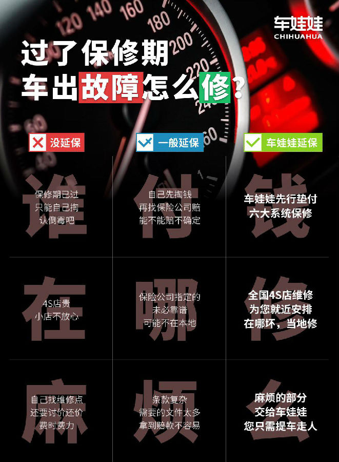 车娃娃延保可为车辆提供延长保修服务,最长保障8年,20万公里,具有时间长,服务广,赔付方便的特点,同时可在APP中实现实时报价与直接购买。车娃娃延保是车险的补充,车险不保的部分,恰是车延保保障的范围,如:发动机、变速箱、离合器、传动系统、燃油系统与刹车系统等。一次小小投入、给客户大大保障,真正实现更省心的汽车延保服务,车娃娃充分起到让消费者省心、省时和省钱的作用,并且也会促进车辆的保值。