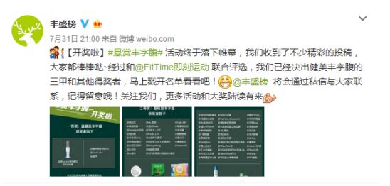 7月31日晚九点,@丰盛榜官微正式公布了#悬赏丰字腹#的获奖名单,为期四天的悬赏活动圆满落幕。虽然举办时间较短,但此次悬赏活动在网络上引发了广泛热议,掀起一股“丰字腹”健身潮流。截止日前发稿,#悬赏丰字腹#微博话题点击量已超过了3748万人次,讨论量已达12.4万人次。