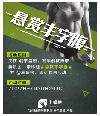 本次热门话题#悬赏丰字腹#,缘起于网络热议的 #丰字腹行动#——由国家健身形体冠军、健身专家@官加荣发起的接力挑战“丰字腹行动”,行动一经发起,便成功引爆健身圈,网友纷纷跟帖效仿,接力展现自己的健美腹肌,截止日前阅读量已超9200万人次。随后为助力“丰字腹行动”,“丰字腹”概念提出者丰盛榜,携手十大健身教练于广州塔下炫腹“挑战小蛮腰”,备受关注,火爆羊城。在一波接一波网络热议话题的助攻下,今年夏天“丰字腹”无疑成为了网络焦点,几度登上了微博热搜话题榜,吸引国内外健身达人的广泛关注。