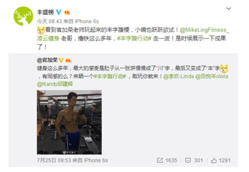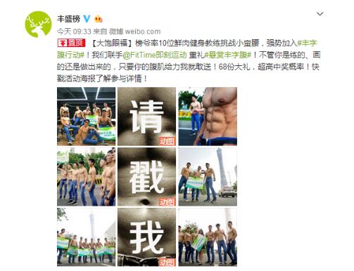 “丰字腹”活动接近尾声,但是引燃“丰字腹”的健身热潮却势不可挡。时下不少网友依旧在微博上秀出自己的八块腹肌健美身材,持续接力这股炫腹热潮,并引来国外友人积极参与,纷纷大秀丰字腹吸睛无数。