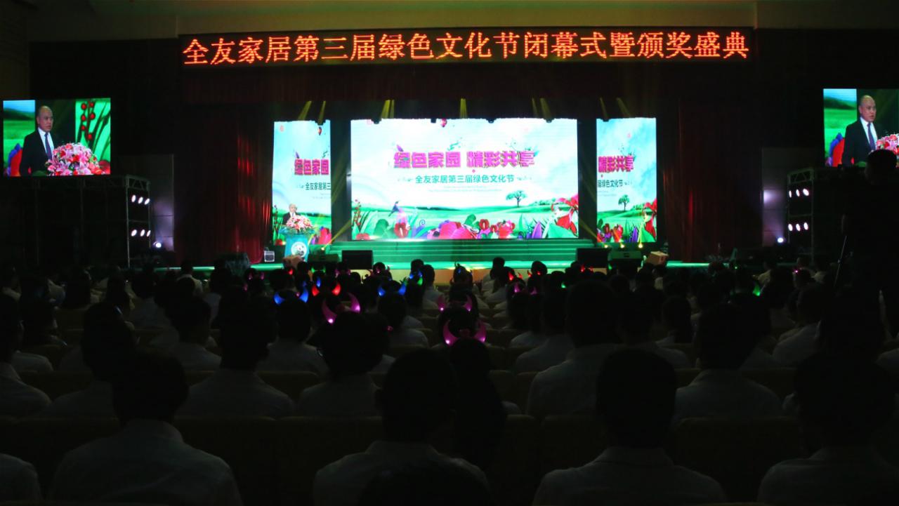 在精彩的文艺表演和颁奖环节后,18个子项目的承办单位代表手持彩旗,齐聚舞台。总裁办主任蒋总宣布:“‘绿色家园·精彩共享’全友家居第三届绿色文化节圆满闭幕!”礼花绽放,欢呼声四起,全场一片沸腾,欢庆第三届绿色文化节闭幕的喜悦洋溢在每一位全友员工的脸上。