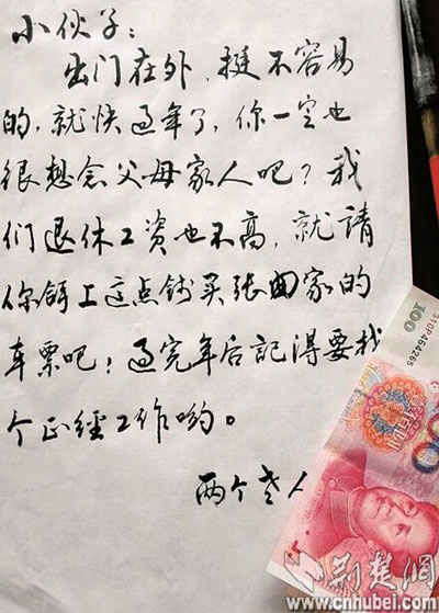 这次是去深圳的老同事家玩,得2个月,要到年后才能回来,两老商量将“压岁钱”涨到三百。当了一辈子语文老师的他们,在信中语,长地写道:小伙子,出门在外挺不容易的,就快过年了,你一定也很想念父母家人吧?我们退休工资也不高,就请你拿上这点钱,买张回家的车票吧。过完年后,记得要找个正经工作。