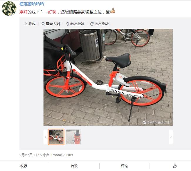 在性能方面,摩拜新车还率先引入专业级“骑行功率”概念。骑行功率可简单理解为骑行时花费的力气,越低说明骑车越省力。摩拜单车人体工学实验室的数据显示,当用户以每小时10km的速度骑行时,全新一代摩拜单车的骑行功率仅为其他品牌共享单车的67%;当速度达到每小时20km时,进一步降低至54%。自投入市场以来,摩拜新车多次被用户们称赞好骑,网友榴莲酱哈哈哈:“摩拜的这个车,好骑,还能根据身高调整座位,赞。”