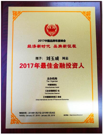 峰会对2017年度在各行业领域品牌建设上有突出贡献的个人及企业进行了表彰,火理财投资合伙人、泉通股权投资基金投资合伙人、信淦资产投资合伙人刘玉成先生,凭借在金融投资领域的突出贡献,荣获“2017年最佳金融投资人”称号。
