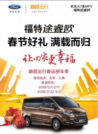这场举国欢庆的春节盛会即将落下帷幕,福特途睿欧携手嘀嗒出行在一路的欢声笑语中,为许多对团圆抱着殷切期望、对未来充满信心的离乡人,提供了一辆象征幸福团圆的大7座,为2018年的春运献出重要的社会责任。也希望福特途睿欧在以后的春节乃至生活中,加倍升级乘客体验,陪伴更多用户的人生旅程。