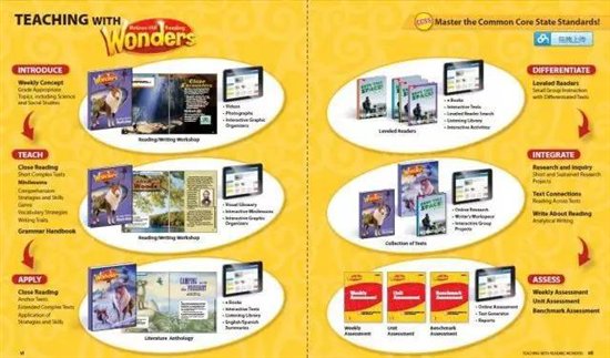 Wonders不仅是一套依据,美国共同教育大纲(CCSS)编写的核心教材,而且作为美国主流小学教材Treasures的升级版,该教材集阅读、写作和文学等多种内容于一体,依据每个年龄段孩子的心智和能力发展,针对各个级别学员编写。不论架构还是题材,都着重于培养有批判性思维、独立思考能力、创新能力的优秀学员,并且内容由浅入深,循序渐进。